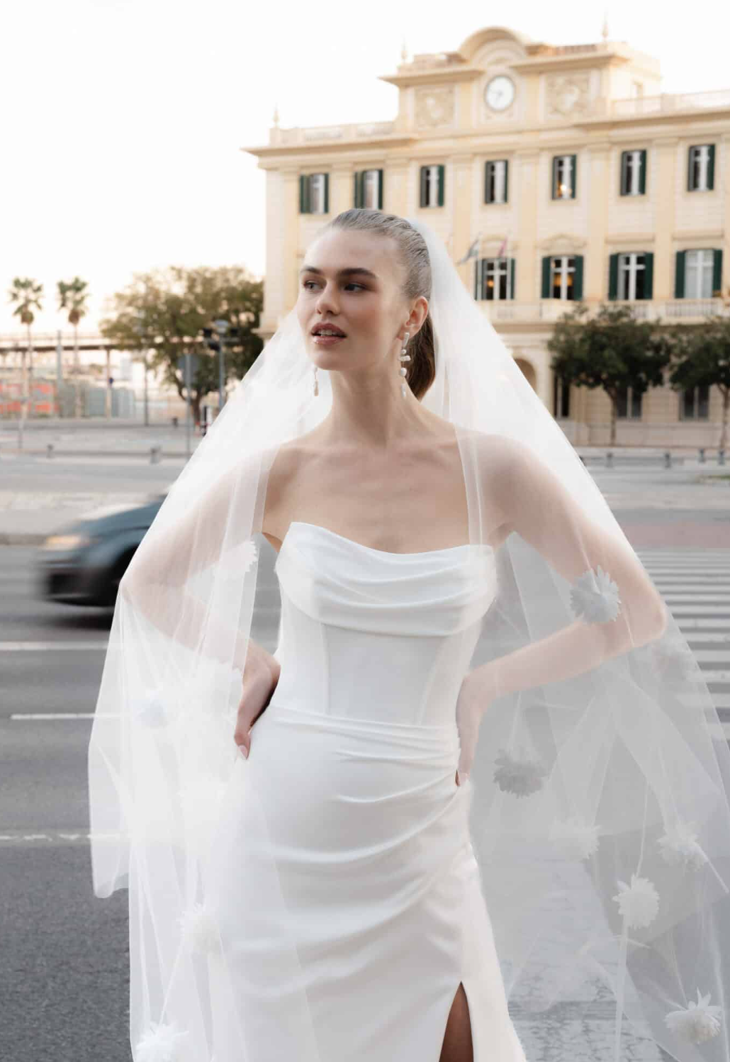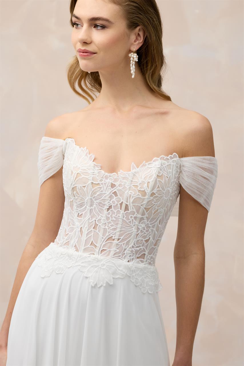 Die Hochzeitskleider haben einen perfekten Schnitt und eine eng anliegende Silhouette. Sie sind aus raffinierten Spitzen wie Chantilly und edlen Stoffen wie Chiffon und Seide gefertigt. Auffallend ist dabei vor allem das Spiel mit Texturen statt mit Mustern. Trendige Materialien und Minimalismus – die Brautkleider sind schön in ihrer Einfachheit! Die Marylise Braut ist eine zeitgenössische Prinzessin, die selbstbewusst ist und sich von ihrer weiblichen Seite zeigen möchte.
